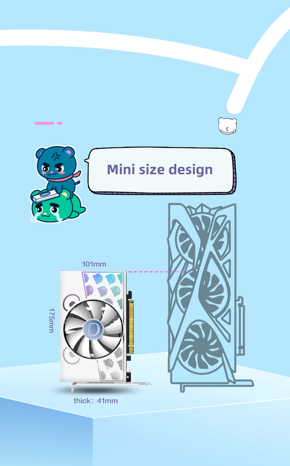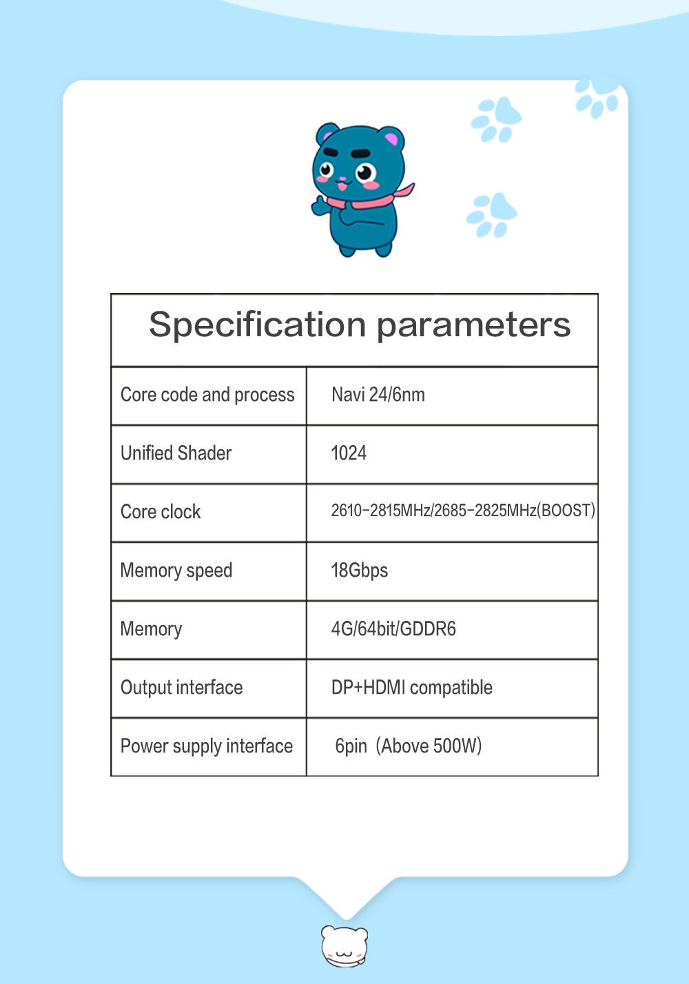 Core code name and process: Navi 24/6nmUnified shaders: 1024Core frequency: 2610-2815MHz/2685-2825 (standard frequency/overclocking, gaming/acceleration, default standard frequency)Memory speed: 18GbpsVideo memory capacity and specifications: 4G/64bit/GDDR6Bus interface: PCI-Express 4.0 x4Maximum resolution: 7680*4320(DP)Power supply design: 5+2 phasesExternal power supply: 6 PIN (power supply requires more than 500W)Graphics card size/weight: 172mm long, 101mm high, 41mm thick/531g